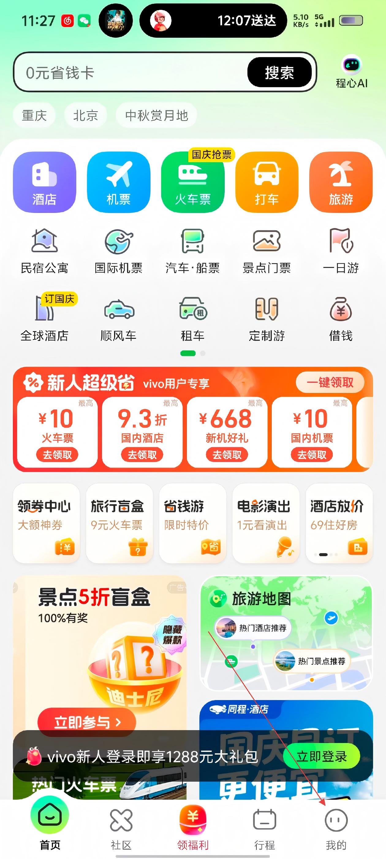 2、进入APP首页,有酒店、机票等功能入口,点击右下角【我的】,进入个人相关页面。