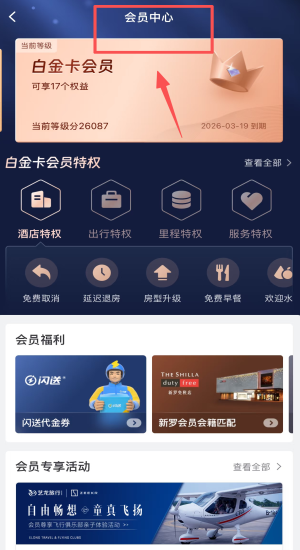4、打开“会员中心”查看白金特权,免费取消升房等权益一目了然。