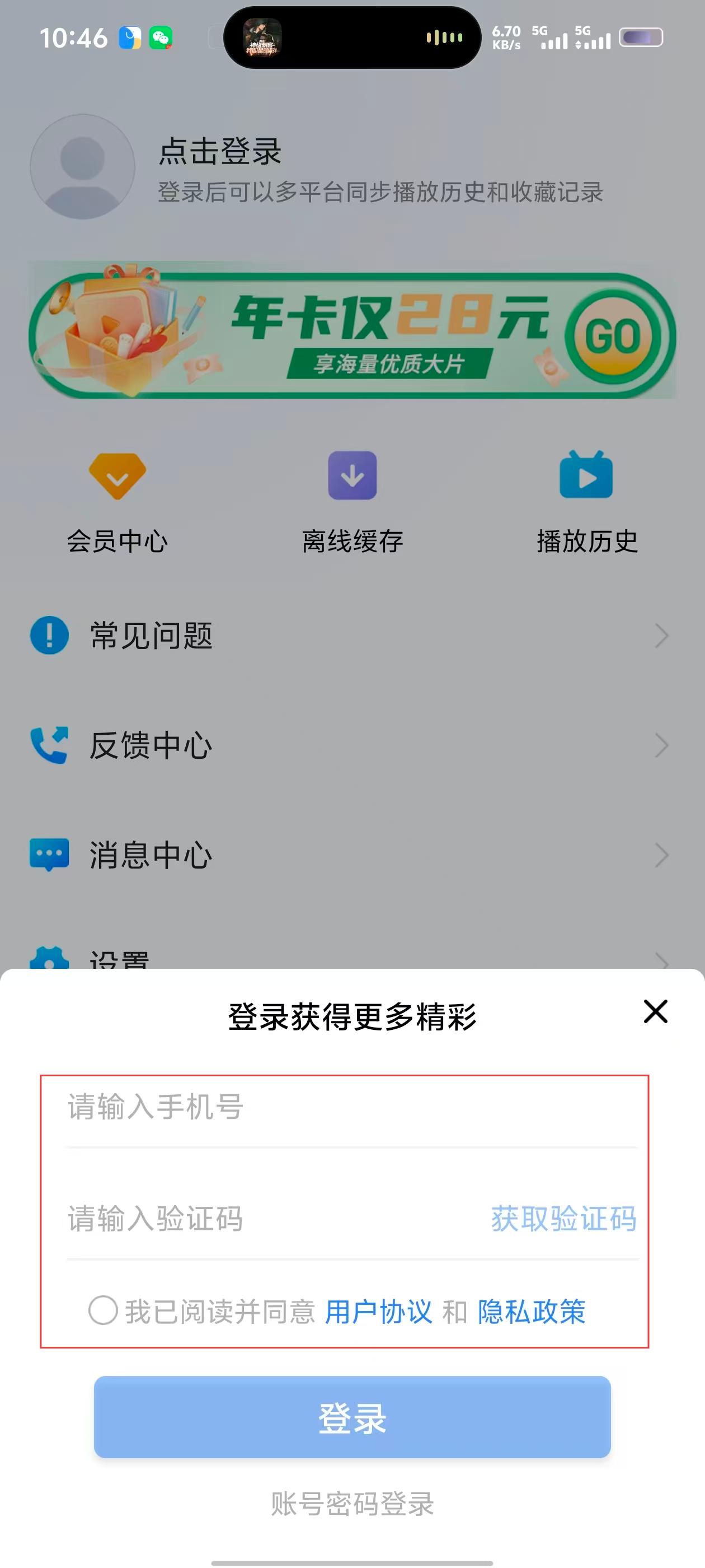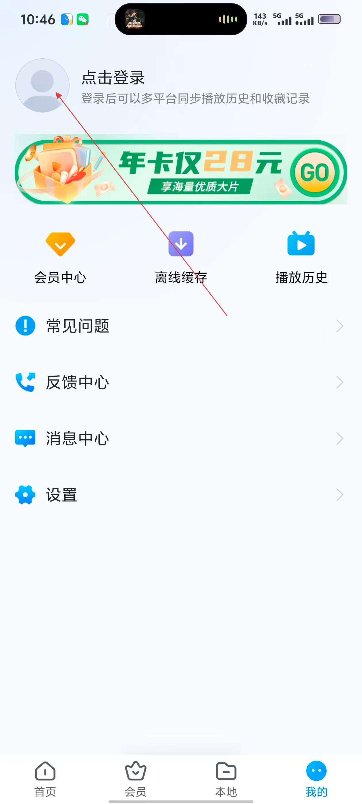 2、在个人页面,可看到【点击登录】入口,登录后能多平台同步播放历史和收藏记录,还有会员中心等功能。