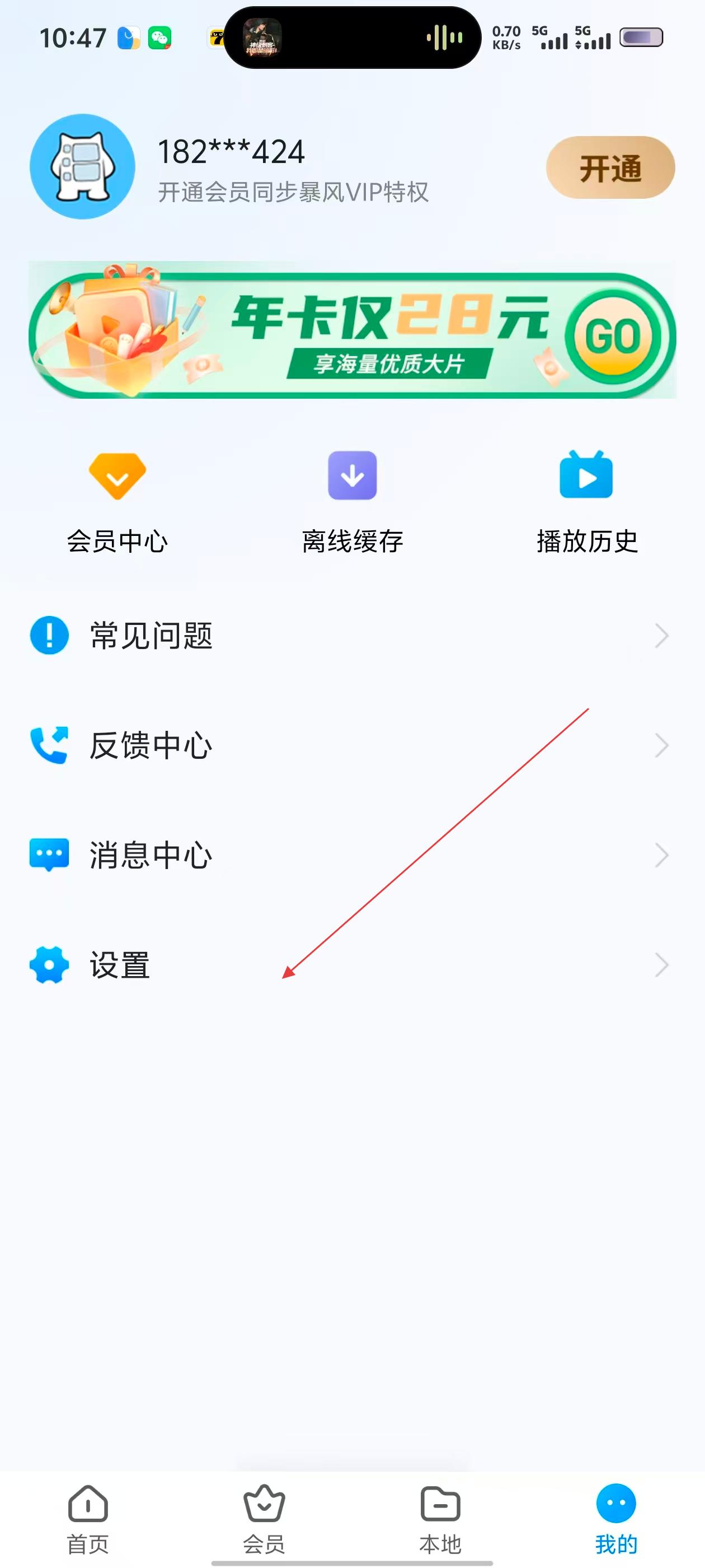 2、在个人页面,可看到会员中心、离线缓存等功能,点击【设置】进入设置界面。