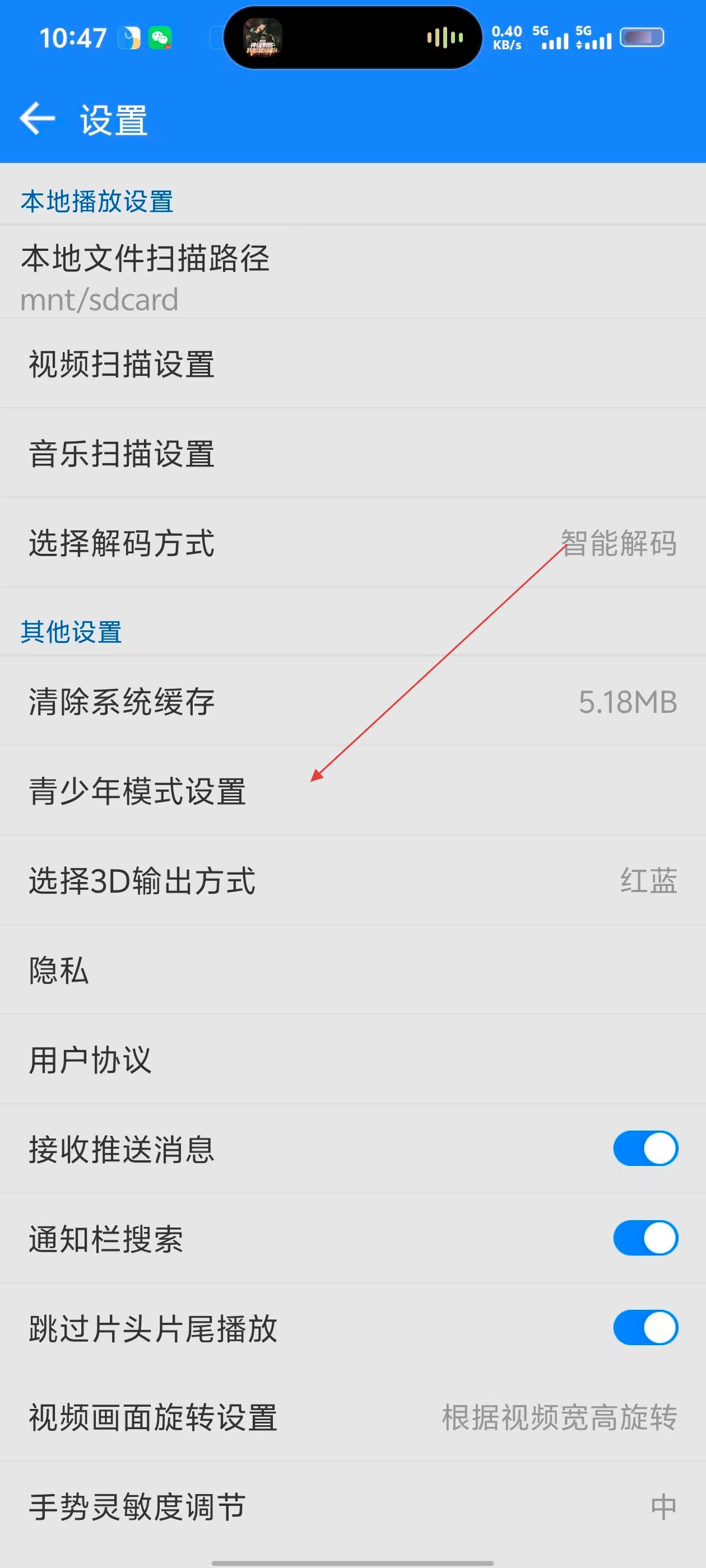 3、进入设置页面,能看到本地播放设置、其他设置等板块,找到并点击【青少年模式设置】。