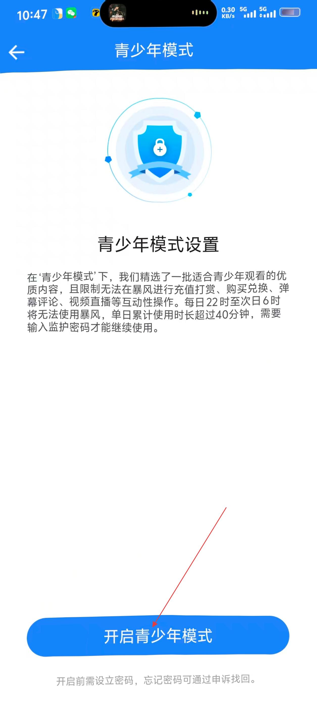 4、进入青少年模式页面,了解模式相关说明后,点击【开启青少年模式】即可启用该模式。