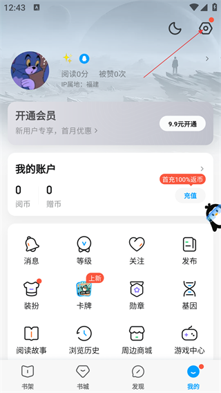 2、在【我的】页面点击右上角设置图标,进入设置页面。