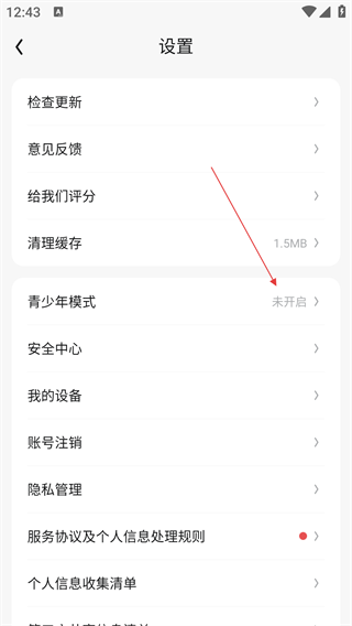 3、在设置页面找到【青少年模式】选项,点击进入青少年模式设置页面。