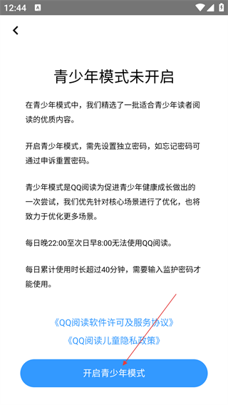 4、在青少年模式设置页面点击【开启青少年模式】,按照提示设置独立密码,即可开启该模式,为青少年提供优质阅读内容并限制使用时间。