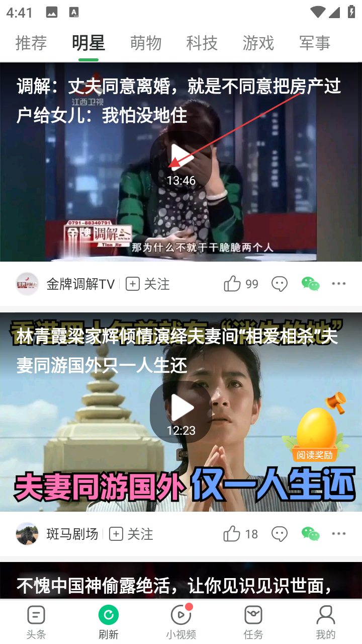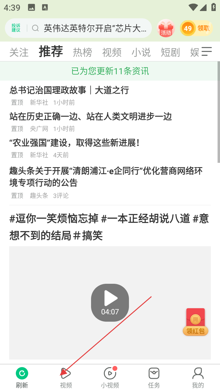 1. 打开趣头条APP,进入主界面后,能看到推荐、明星、萌物等频道分类。若想浏览视频内容,点击底部【视频】选项。