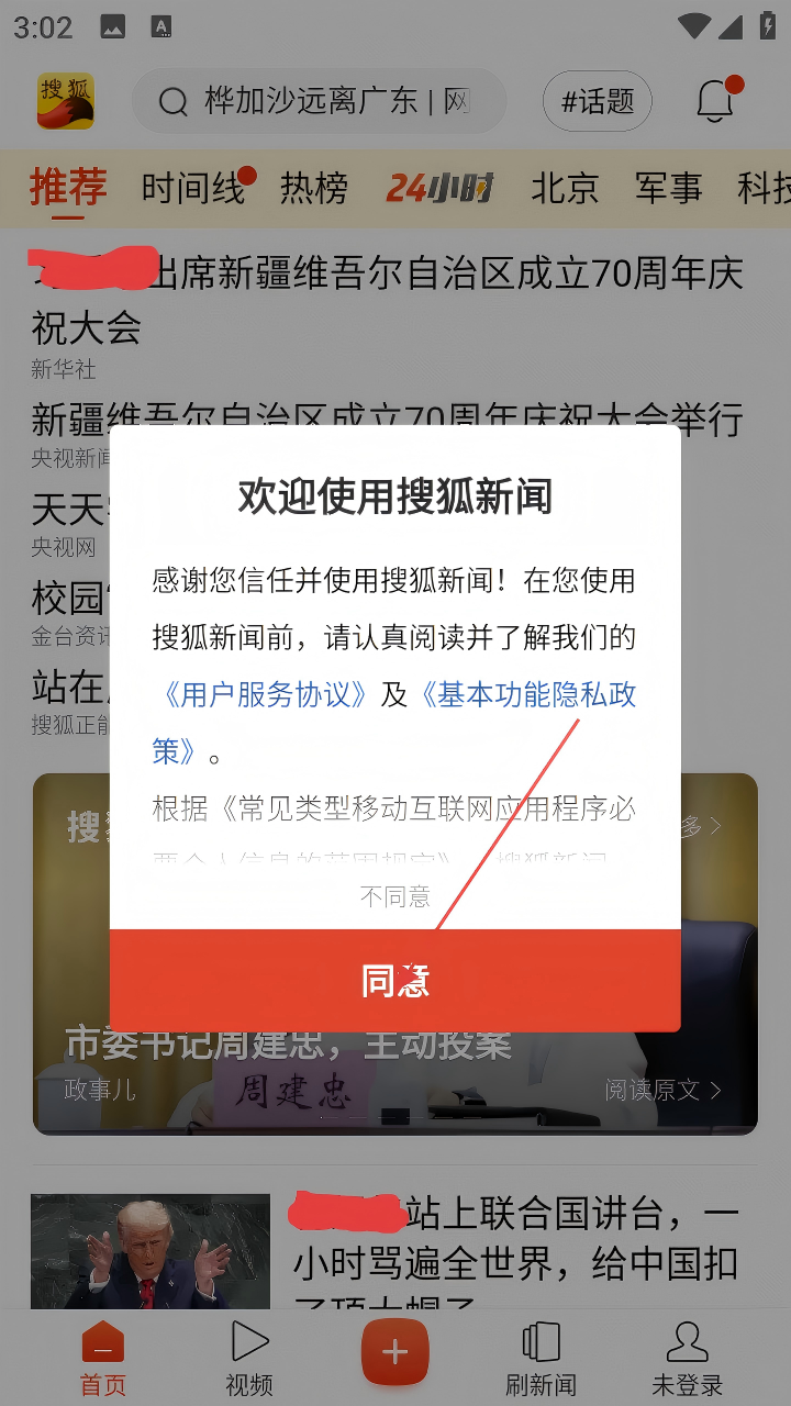 1、打开搜狐新闻APP,在弹出的“欢迎使用搜狐新闻”提示框中,点击【同意】。