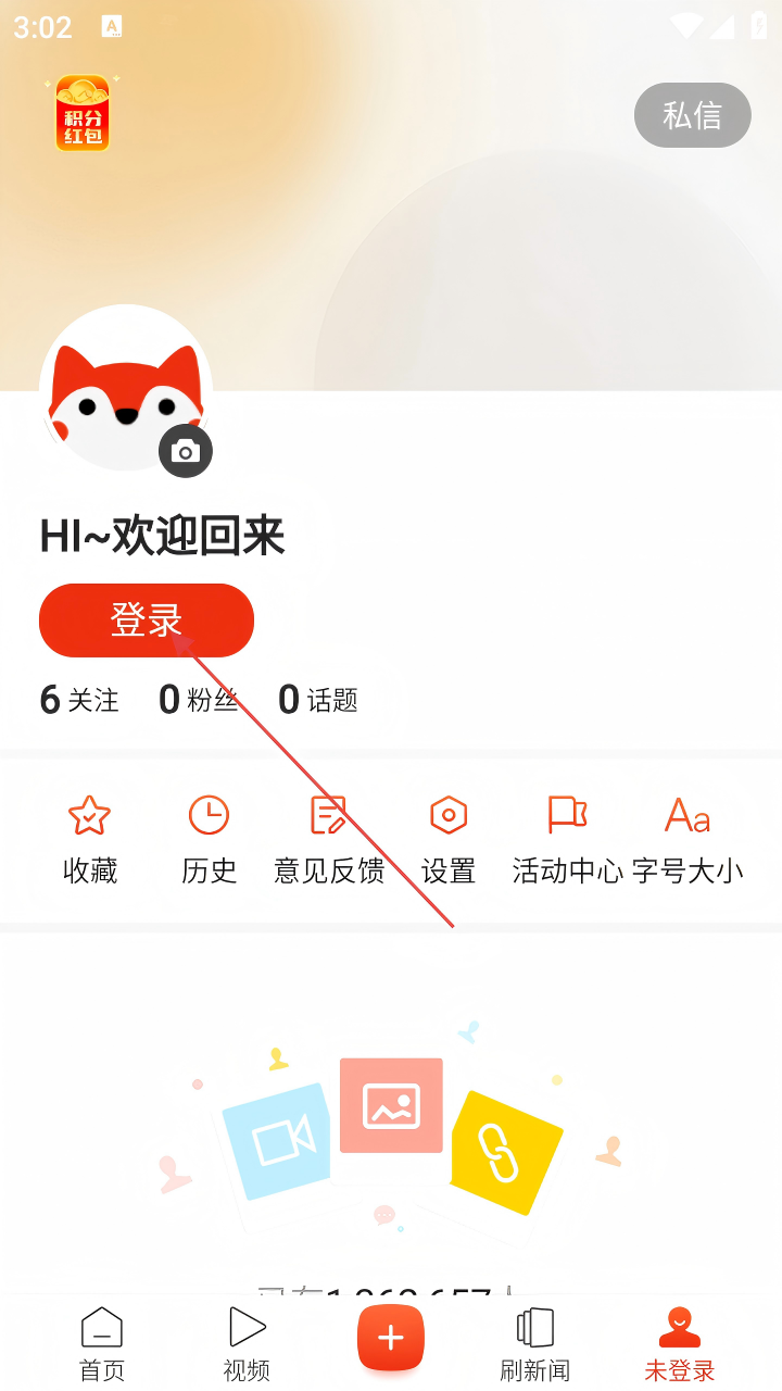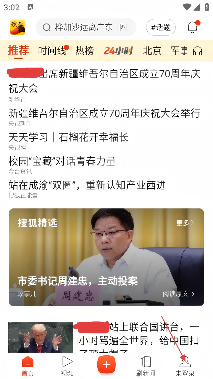 2、进入搜狐新闻首页后,点击右下角【未登录】选项,进入个人页面。
