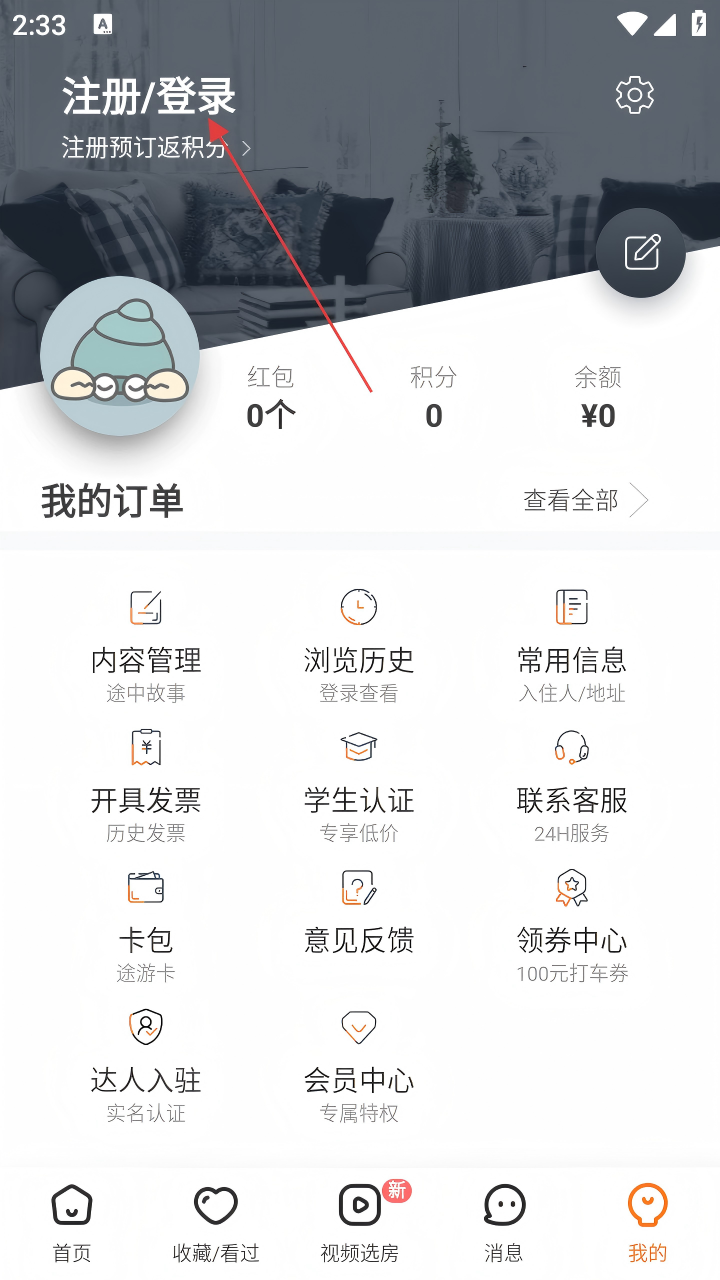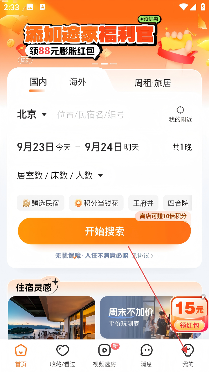 1、打开途家民宿APP,进入首页后,点击右下角【我的】,进入个人相关页面。