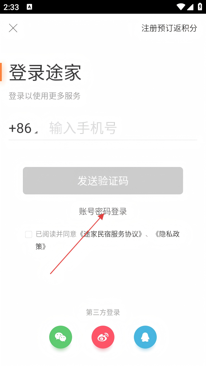 3、在登录页面,可选择输入手机号获取验证码登录,或点击【账号密码登录】。
