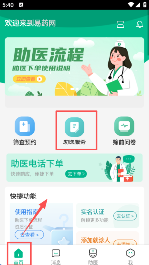 1、进入易药网首页,点击 “助医服务” 选项,可进入对应的服务页面,同时首页还展示助医流程等内容。