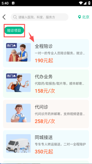 2、进入助医服务页面后,能看到陪诊项目分类,包含全程陪诊、代办业务等服务,各服务标注了对应价格。