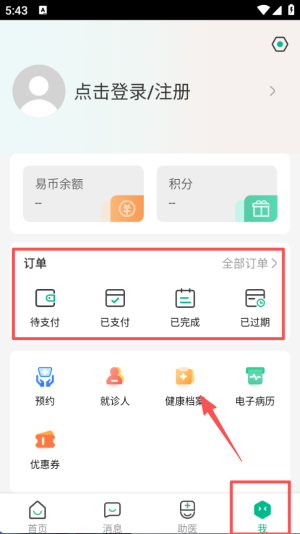 3、点击底部 “我” 的选项,进入个人页面,这里可进行登录注册操作,还能查看订单相关的待支付、已完成等分类。