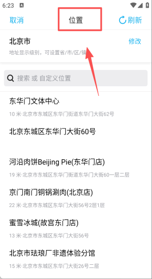 3、点击位置栏搜索“东华门”,从列表挑精确地址替换默认定位。