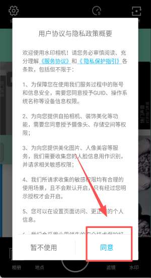 1、阅读协议后点“同意”授予设备与相机权限,立即进入拍摄界面。