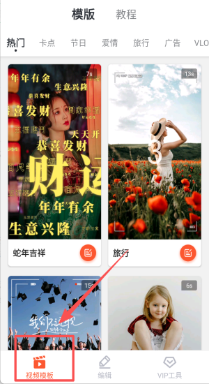 3、进入模板区按热门节日旅行分类挑选年年有余卡点素材。