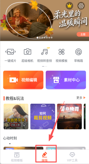 2、首页点击一键成片或视频模板选择柔光里的温暖瞬间主题。