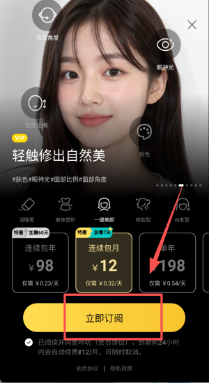 3、进入会员页选连续包月¥12,点击立即订阅解锁AI发型美体特效。