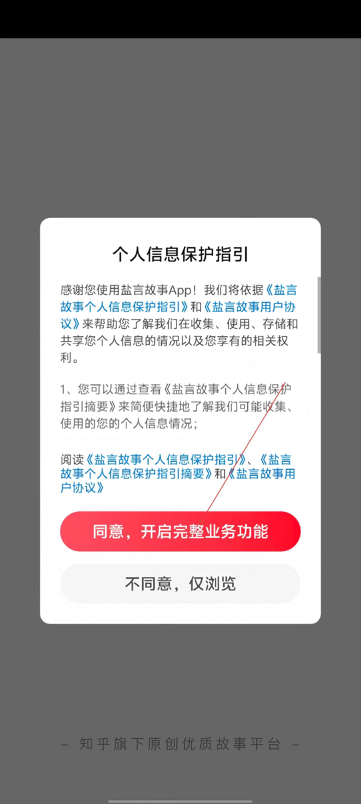 1、打开盐言故事APP,首先会弹出《个人信息保护指引》弹窗,你可以选择【同意,开启完整业务功能】或者【不同意,仅浏览】。