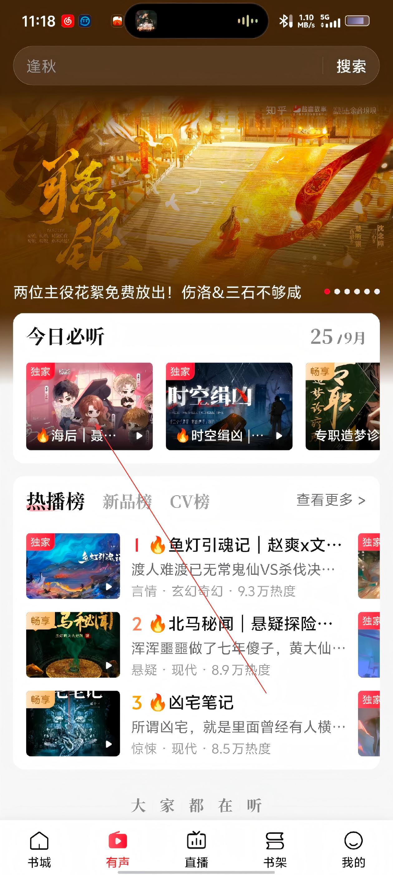 2、在有声频道,可看到“今日必听”“热播榜”等板块,选择感兴趣的有声内容,如《海后》。