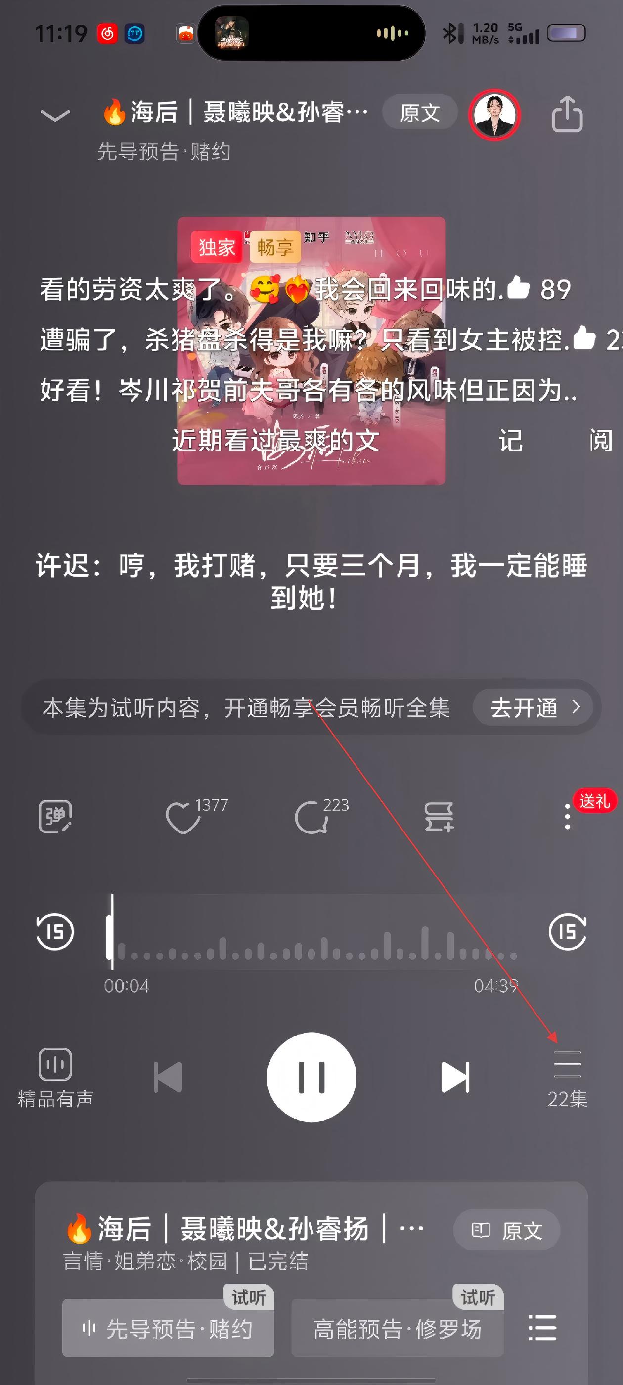 3、进入有声内容播放页面,点击右下角的集数按钮,可查看目录,选择想听的集数。