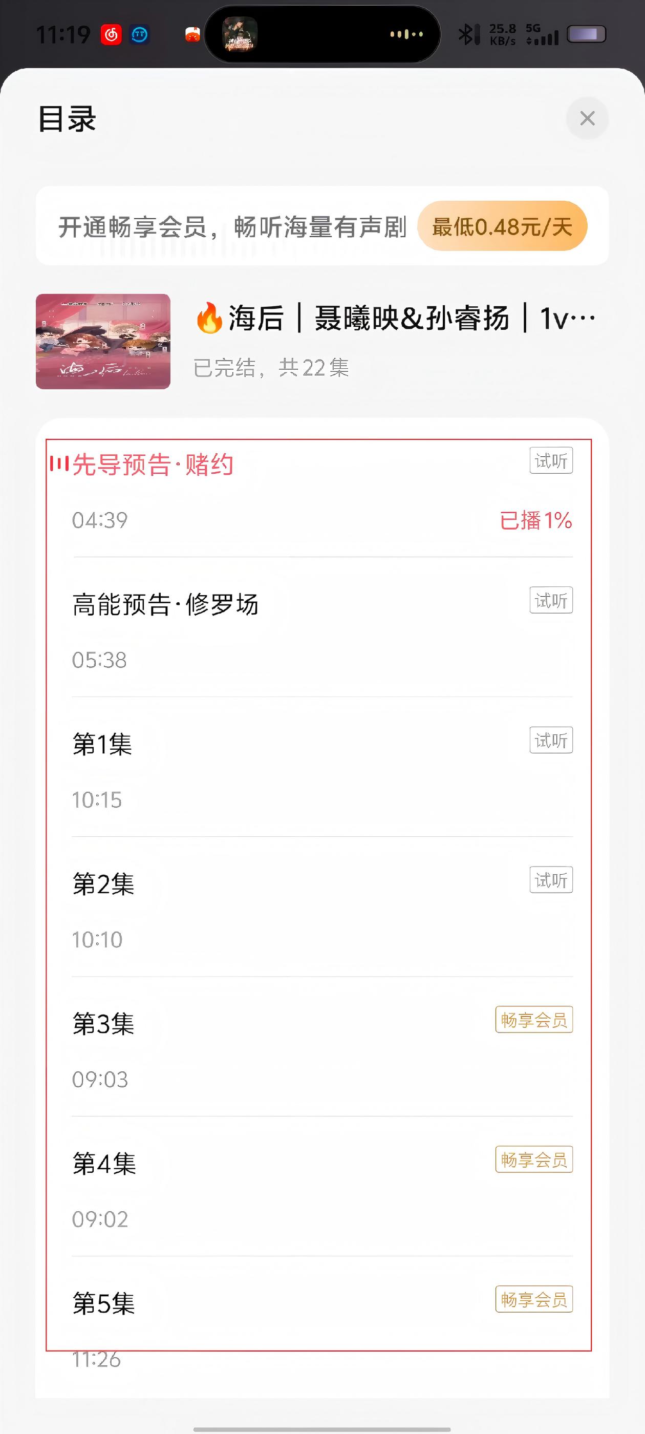 4、进入目录页面,选择想听书的部分,部分内容为试听,若想畅听全集,可开通畅享会员。