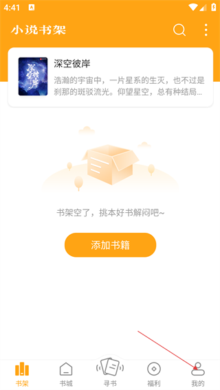 1、在小说书架界面可查看已添加的书籍,点击底部【我的】按钮可进入个人中心界面。