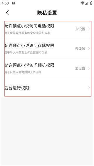 4、在隐私设置界面,可管理顶点小说的电话、存储、相机等权限,保障个人信息安全。