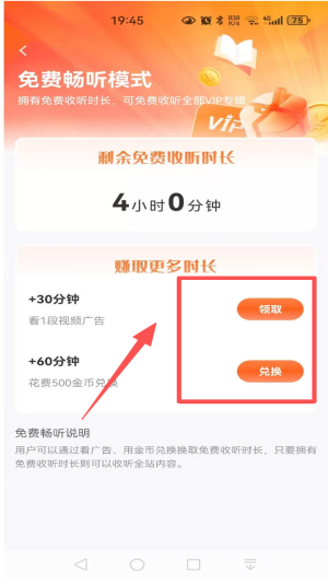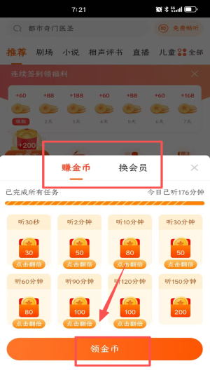 3、完成听书任务点翻倍,集满500金币再兑60分钟免费时长。