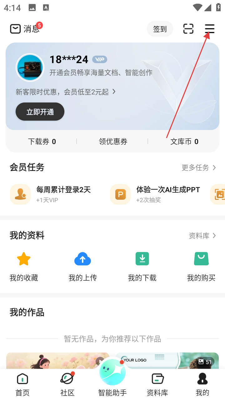 1、打开百度文库APP,进入首页后,点击右下角【我的】按钮,进入个人相关页面。