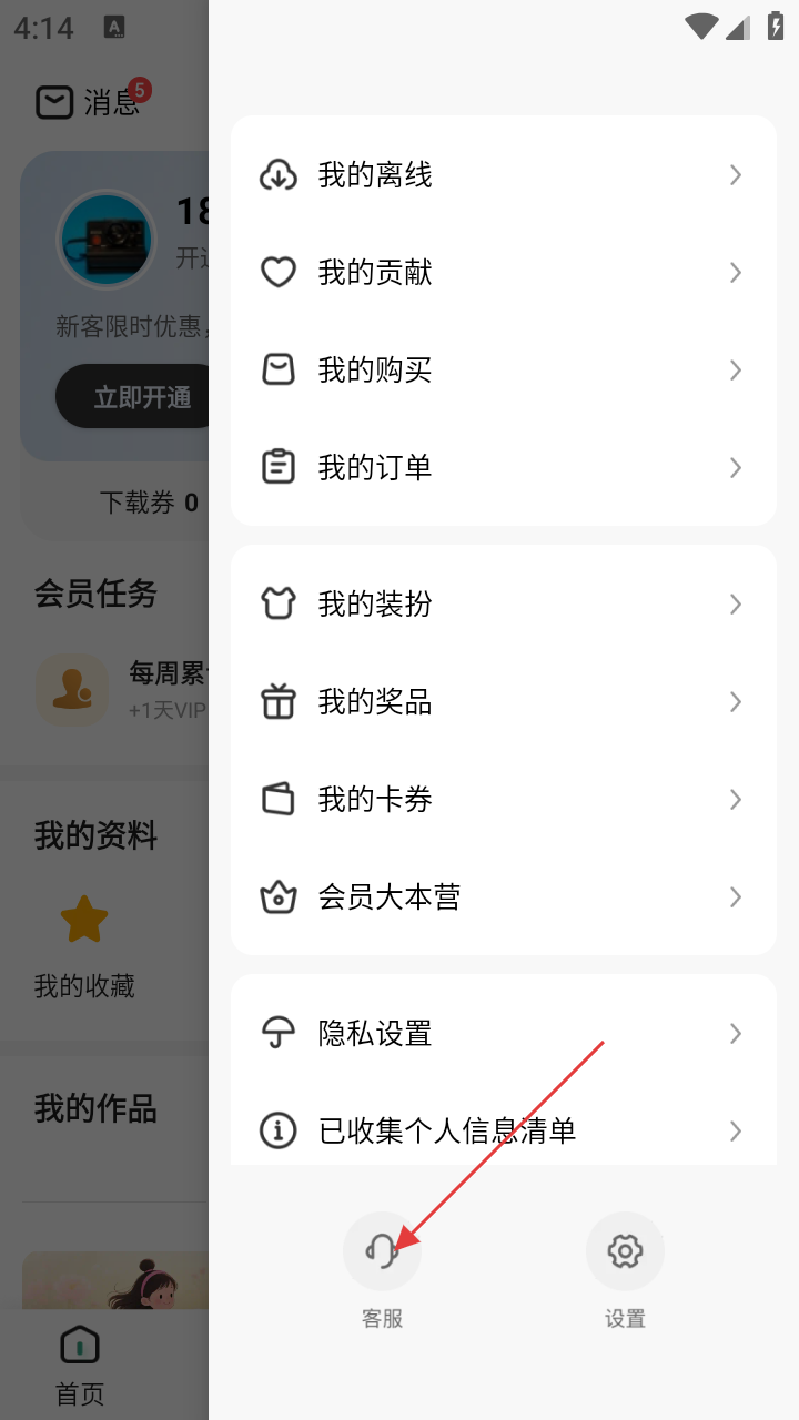 3、在展开的菜单中,找到并点击【客服】选项,进入客服相关界面。