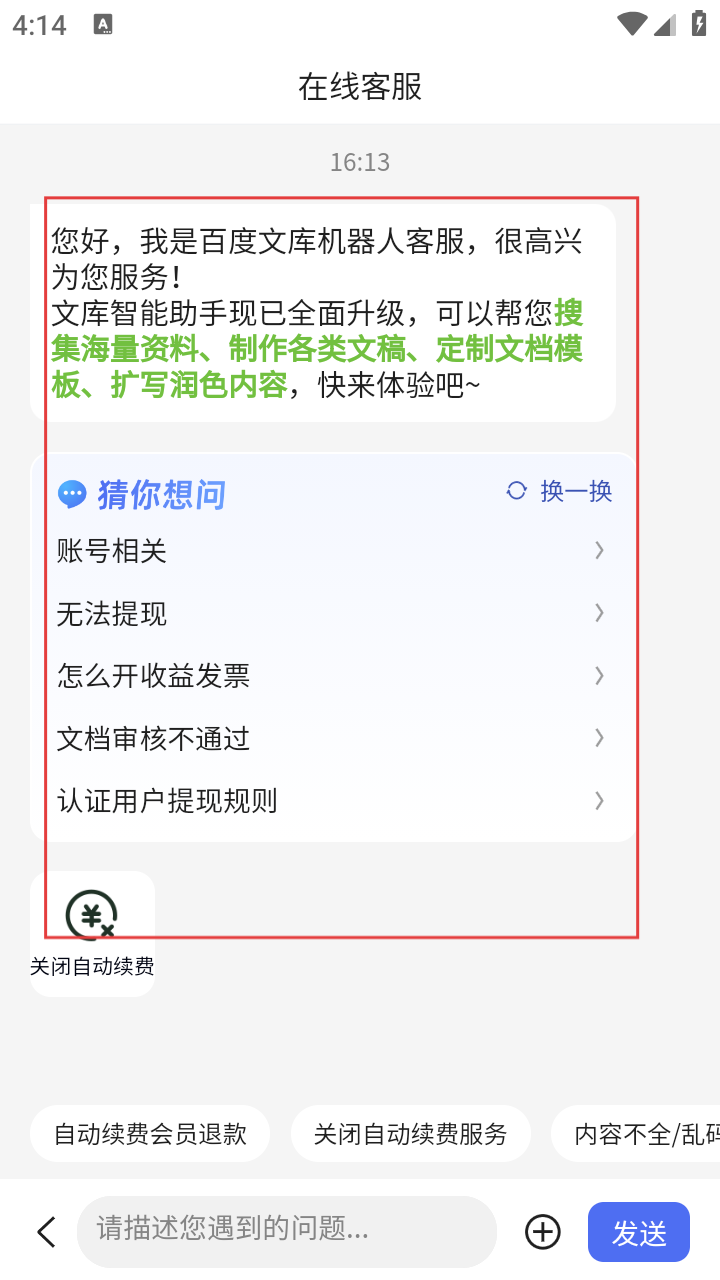 4、进入在线客服页面后,可与百度文库机器人客服交流,还能查看【猜你想问】等板块内容。