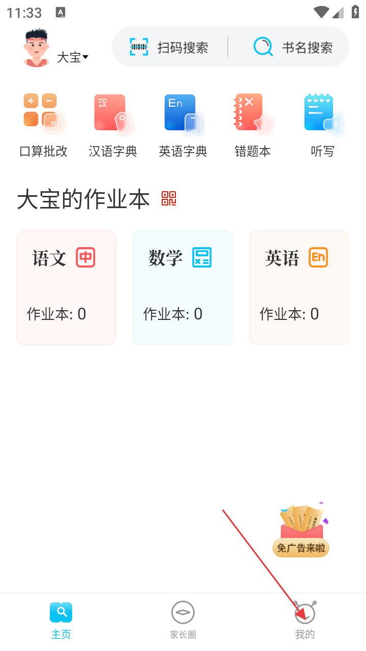 1、进入作业精灵主页,可使用【口算批改】【汉语字典】【英语字典】等功能,点击【我的】可进入个人页面。