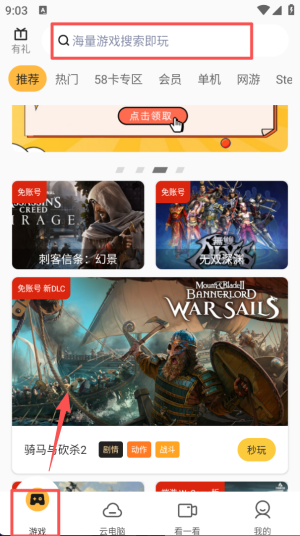 1、进入 “游戏” 页面,顶部有搜索框可查找游戏,下方展示多款免账号游戏,包含不同分类标签。