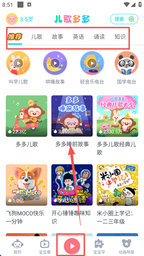 2、点击底部中间的播放键,进入推荐页面后,能看到叫早儿歌、哄睡故事等板块,还有各类儿童内容的播放量数据。