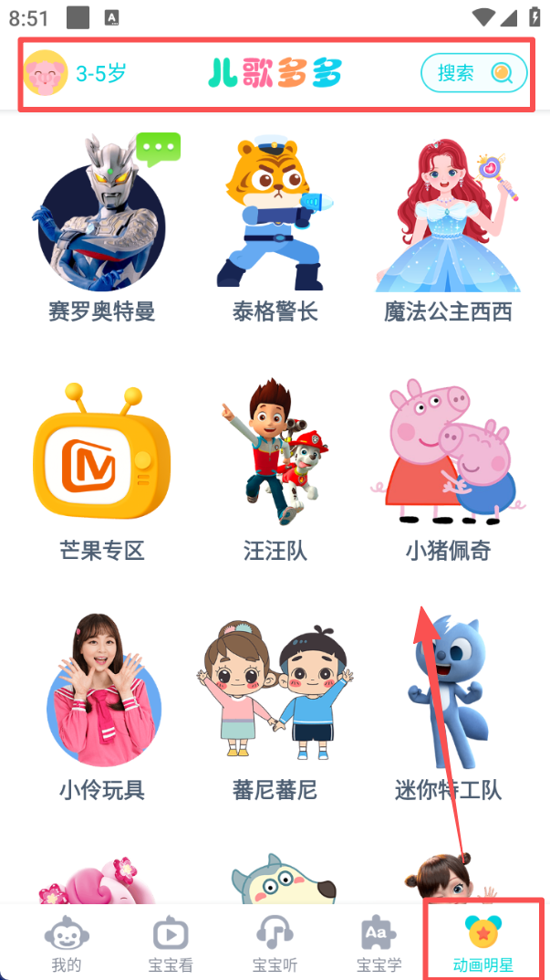 4、点击底部 “动画明星”,页面会展示赛罗奥特曼、小猪佩奇等动画 IP 专区,可直接进入对应内容的播放界面。