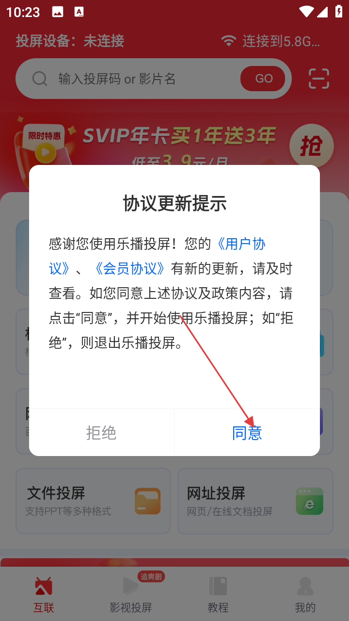1、打开乐播投屏APP,首先看到协议更新提示页面,点击【同意】按钮。