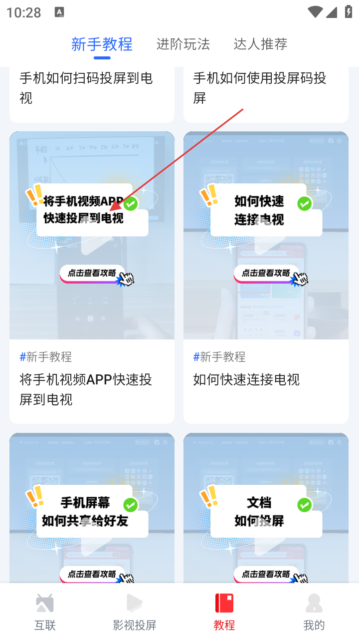 3、在教程页面,默认显示【新手教程】板块,可看到“将手机视频APP快速投屏到电视”“如何快速连接电视”等新手教程内容。