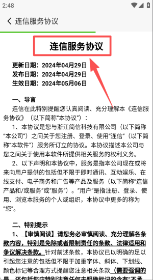 4、查看2024新版连信服务协议,确认条款后继续安全使用。