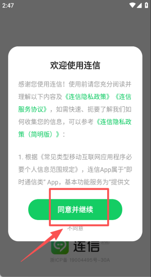 1、阅读隐私政策与服务协议后,点击同意并继续进入连信。