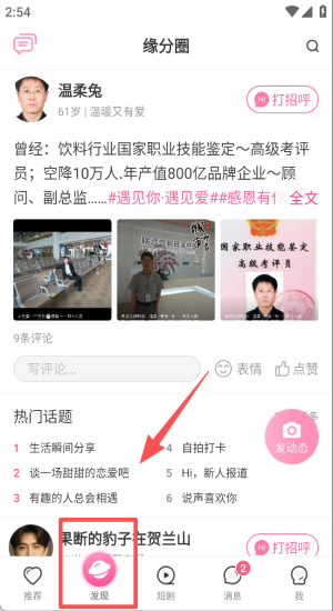 3、进入缘分圈给温柔兔动态点赞评论,发布自拍打卡吸引更多关注。