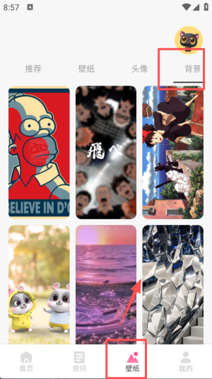 4、切换到 “壁纸” 板块,选择 “背景” 分类,页面会展示对应类别的素材内容供查看。