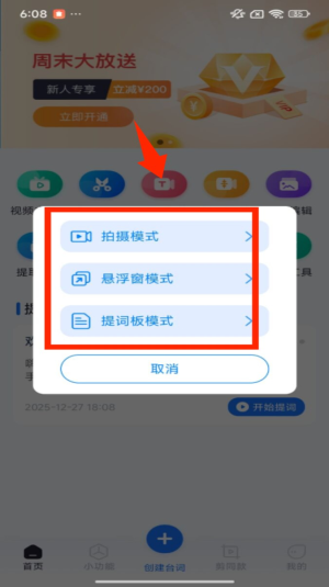2、点击首页的功能按钮,会弹出选项菜单,里面包含拍摄模式、悬浮窗模式、提词板模式三种不同的使用模式。