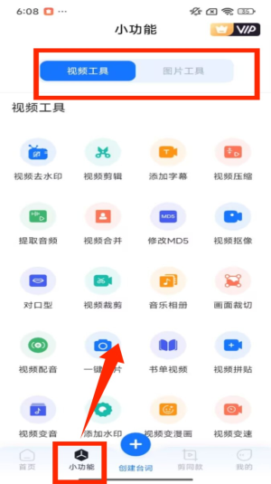 3、切换到小功能页面,顶部可切换视频工具与图片工具,视频工具板块下有去水印、剪辑等多种视频处理功能。