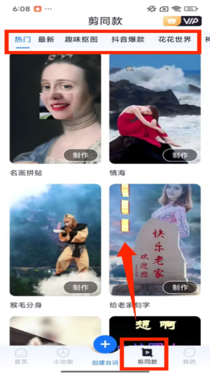 4、打开剪同款页面,顶部有热门、最新等分类标签,下方展示多款可制作的模板,每个模板旁都设有 “制作” 按钮。