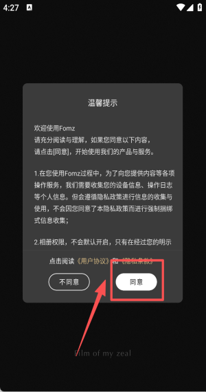 1、阅读温馨提示后点同意,授权设备信息与相册权限,即可开启Fomz拍摄服务。