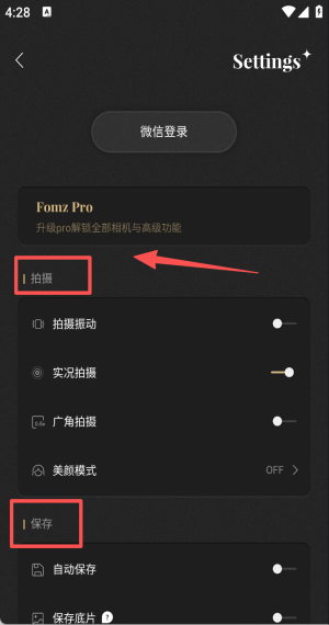 4、进入Settings选微信登录,升级Fomz Pro解锁全部相机与高级功能。