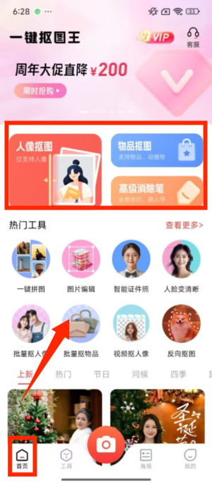 1、打开应用后进入首页,能看到 “人像抠图”“物品抠图” 等功能选项,还有热门工具与各类模板展示。