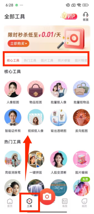 2、点击底部 “工具” 按钮,进入全部工具页面,这里有核心工具、热门工具等多个分类可切换查看。