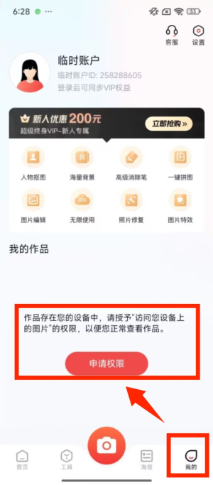 4、进入 “我的” 页面,若要查看作品,需授予 “访问设备上的图片” 权限,可点击 “申请权限” 按钮操作。
